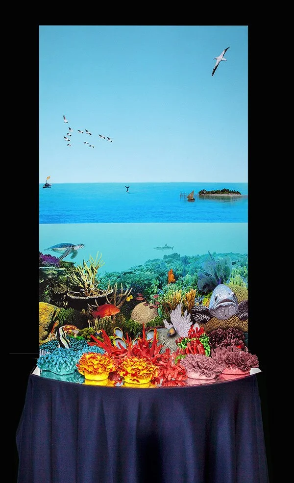 This installation, made with Richard Dana, documents the ongoing destruction of coral reefs around the world. As the water around them warms, the microscopic creatures that live on the surface of the coral and give it its characteristic vibrant colors die off, leaving the coral bleached white. When this happens in repeated years, the corals die. Large sections of the Great Barrier Reef off the Australian coast are now bleached.